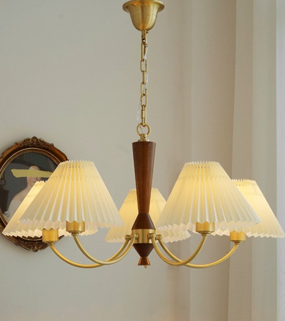 Medieval French pleated fabric all copper chandelier Nordic living room, dining room, homestay, bedroom, retro walnut wood lamp