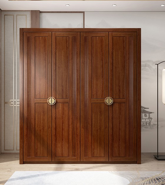 New Chinese style solid wood wardrobe Simple modern solid wood wardrobe Assembly Master bedroom Walnut wood four door wardrobe