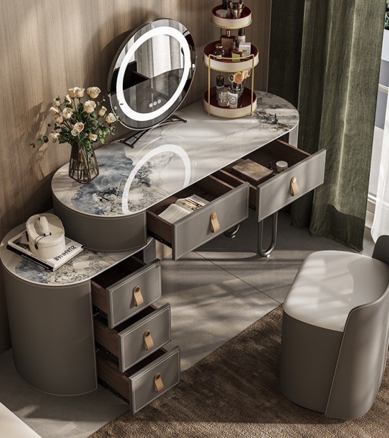 Rock board saddle leather light luxury style solid wood high-end dressing table with integrated storage, modern and simple bedroom dressing table